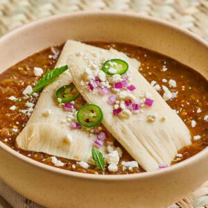 Preparación: Calienta el tamal y báñalo con salsa tatemada caliente. Agrega queso fresco y cebolla por encima.