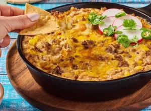 Ingredientes: Frijoles con elote Chata, queso, crema (opcional), toppings al gusto.