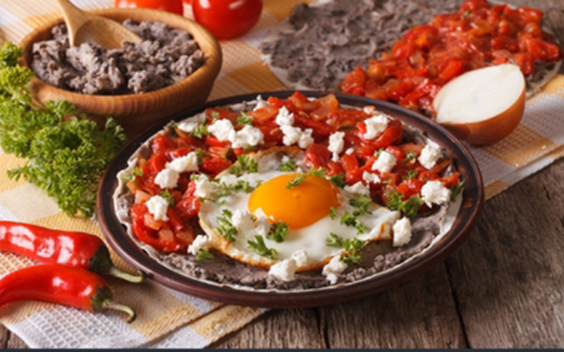 - Huevos rancheros con frijoles negros, es parte del desayuno típico en México, se acompaña con tortillas de maíz, huevos y salsa picante.